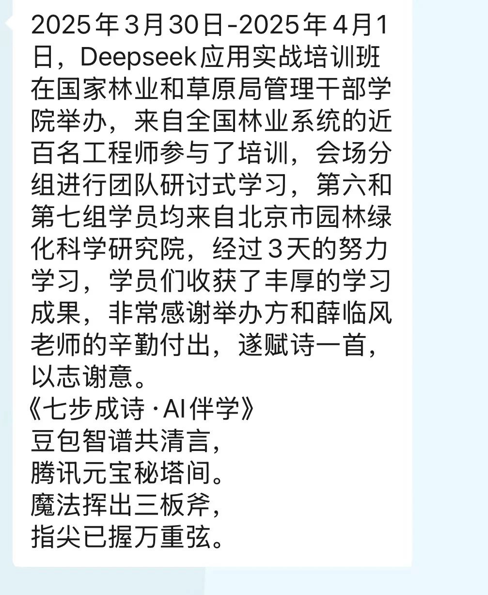 此次培训的成功举办,为林草系统从业人员全面提升工作效率与创新能力高效赋能。通过 DeepSeek 技术的实战应用,学员不仅掌握了人工智能工具的使用技巧,更开拓了 “人工智能+林草” 的创新工作思路。未来,国家林业和草原局管理干部学院将持续推进科技与行业深度融合,以更多元化的培训赋能人才发展,加速人工智能技术在林草生态保护、产业升级等领域的落地应用,为林草行业高质量发展注入更多“智慧动能”。